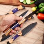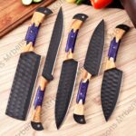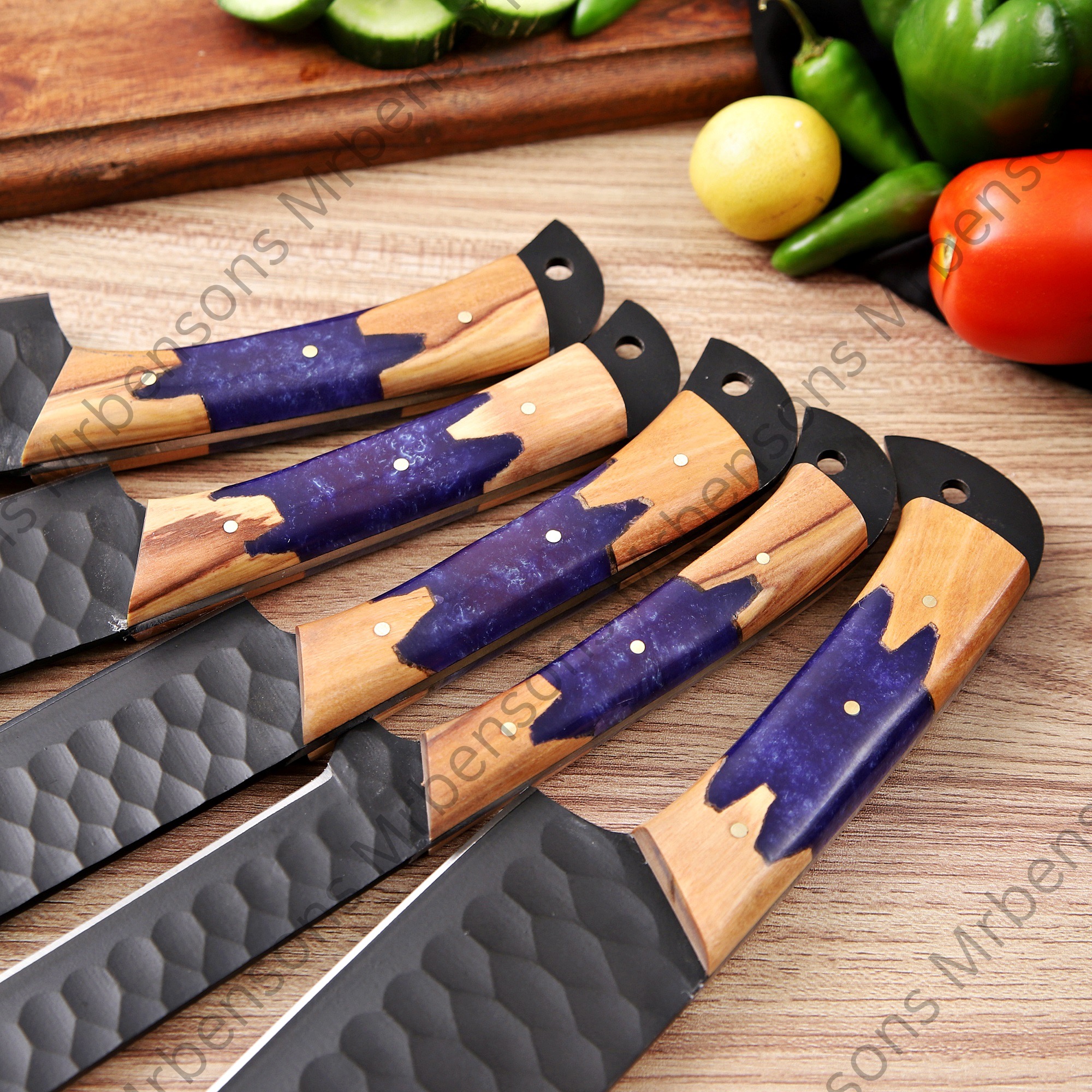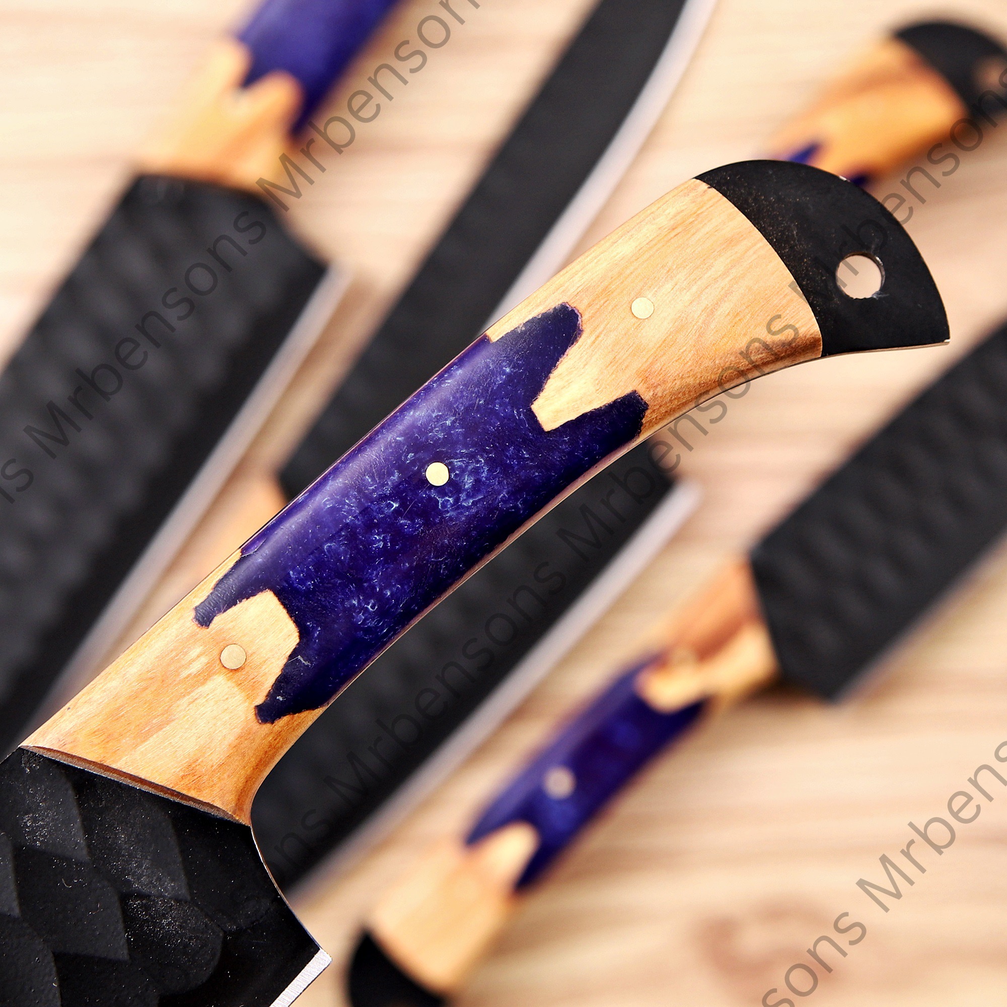 Handmade Black Chef Set Diamond Forge Multi Purpose Chef Knife Set Black Powder Coated Blue Resin Wood Handle Kitchen Knives Gift Christmas.